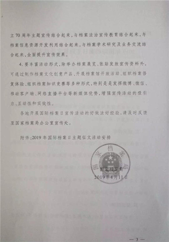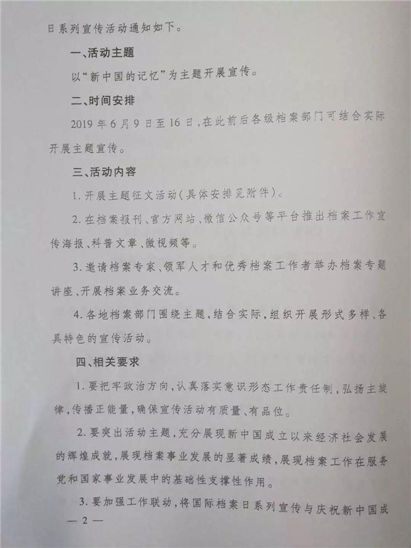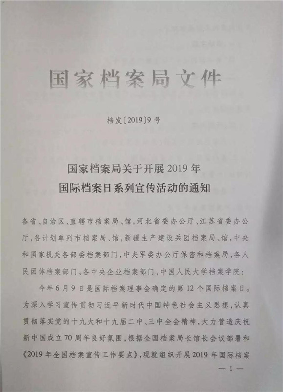 转发《国家档案局关于开展2019年国际档案日系列宣传活动的通知》