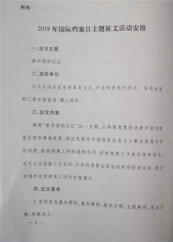 省档案局现将《国家档案局关于开展2019年国际档案日系列宣传活动的通知》进行转发,希望有关单位根据通知精神,以“6·9国际档案日”为契机,紧扣新中国的记忆主题,开展主题宣传,并踊跃参与主题征文活动。