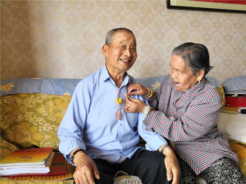 2019年端午节,老伴帮已有63年党龄的党晓宇老人佩戴党徽。他曾任村支书27年,到了晚年仍健康乐观、思维清晰,写下了15万字的回忆录,记录自己一生为农的经历和祖国农村发生的变化