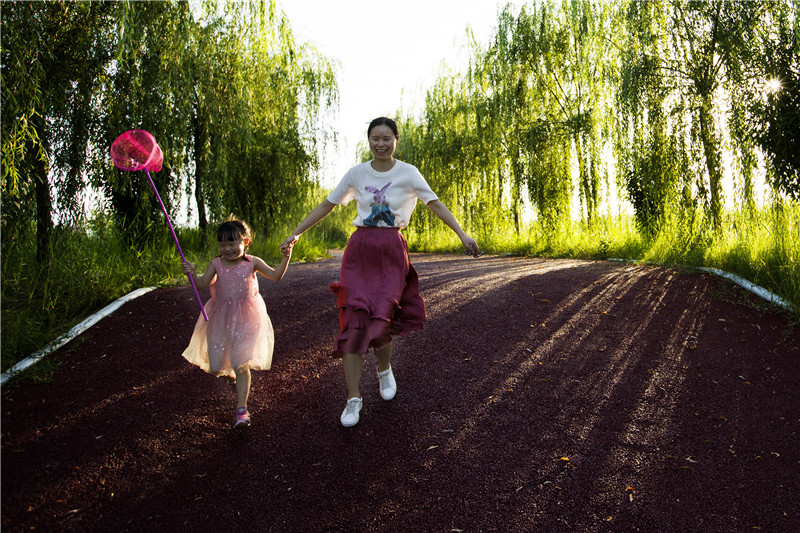 年轻的母亲带着可爱的女儿在环境优美的公园玩耍,幸福满满。有了强的国,才有富的家,在灿烂的阳光下,新时代的年轻人正向快乐出发,一年更比一年好!(咸阳叶淑芳提供)